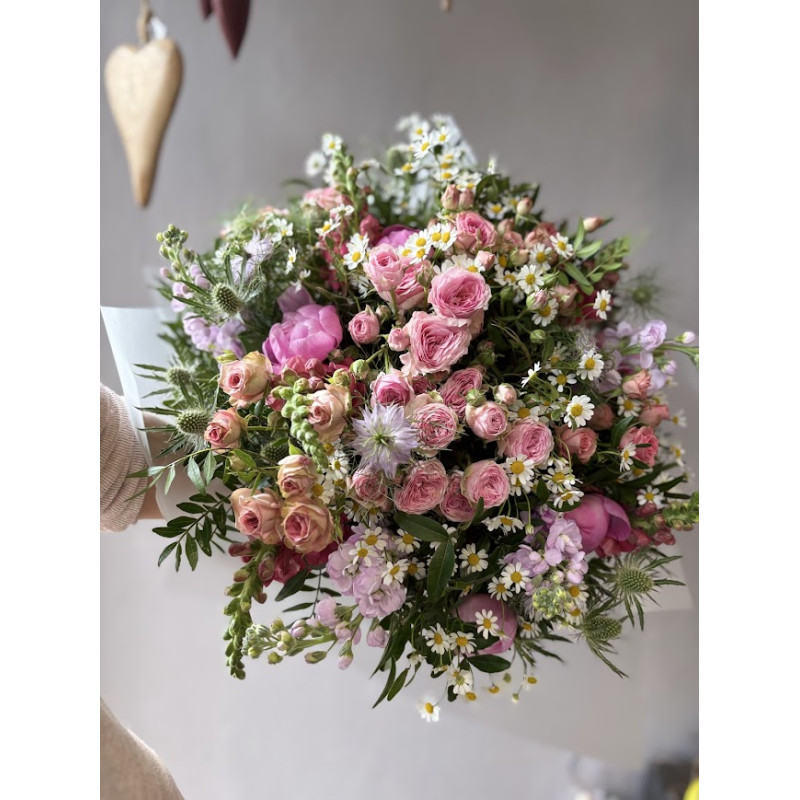 Mix sezonnych kvetov matricaria, delphínum, mini ruže, pivonie. nigella, eryngium, zeleň